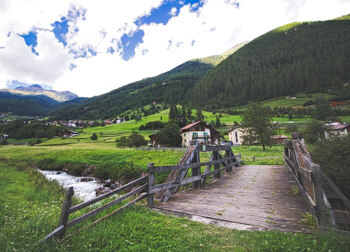 Tog/bus til Ossana. Besøg ved borgen San Michele. Naturvandring til Valpiana, højdeforskel: +224 m, ca. 75 minutter. Videre vandring til Malga Valpiana (1.311 m), ca. 1,1 km, højdeforskel: +89 m, ca. 45 minutter. Naturvandring tilbage til Ossana, højdeforskel: -300 m, ca. 60 minutter. Bus til Pejo Fonti (11 km). Fire overnatninger i Pejo. Morgenmad, frokost og aftensmad inkluderet. (M, F, A)