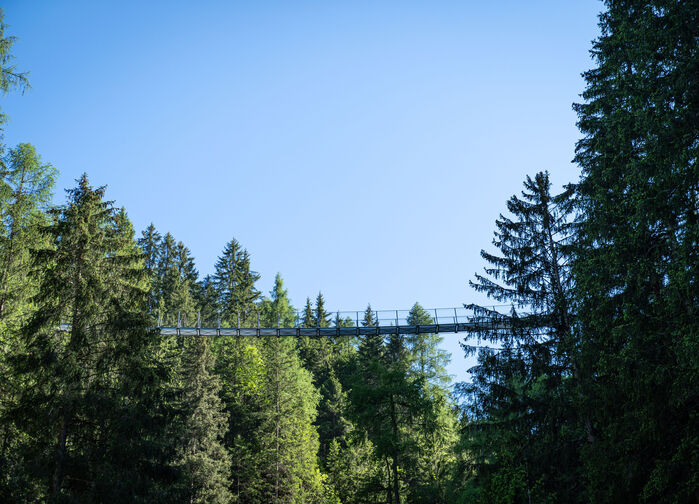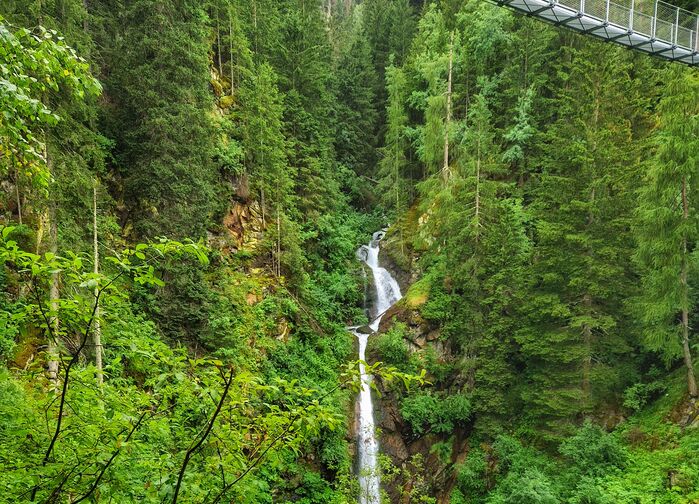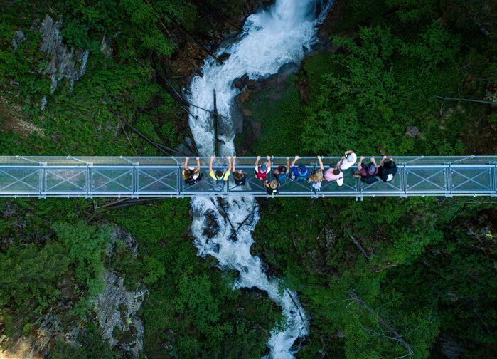 Med bus kører vi til Val di Rabbi. Vandringen følger først et rislende vandløb frem til det imponerende Ragaiolo-vandfald. Her krydser vi kløften via en 100 meter lang tibetansk hængebro, 57 meter over jorden. Der findes også en alternativ sti uden bro. Vandringen fortsætter til en lille bjerggård, hvor vi nyder en piknik med lokale specialiteter som ost og speck. Returen går gennem alpine enge og skov tilbage til bussen. Aftenen er fri i Dimaro. [F, L]
